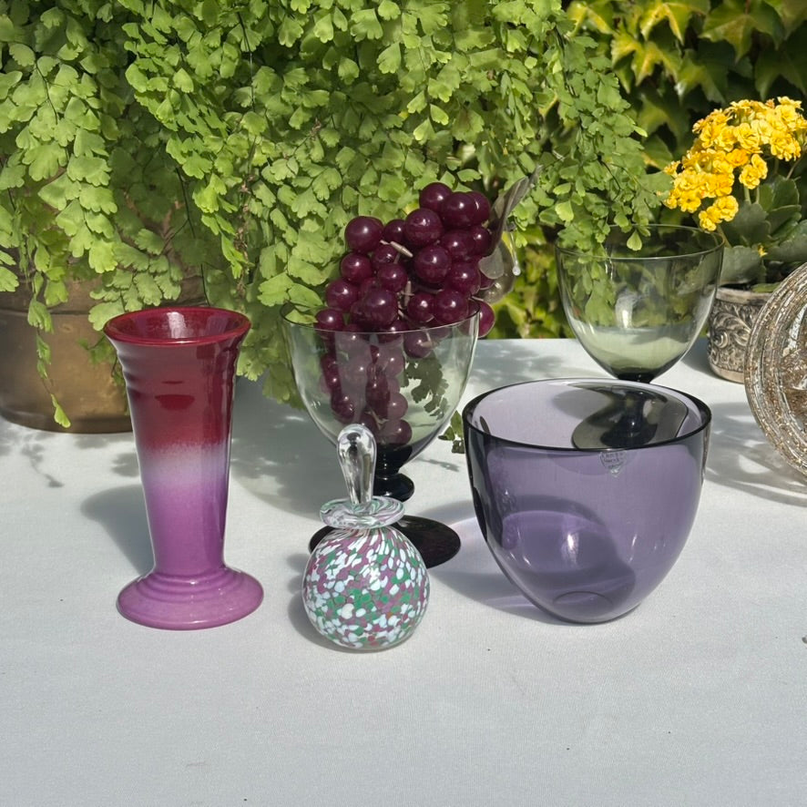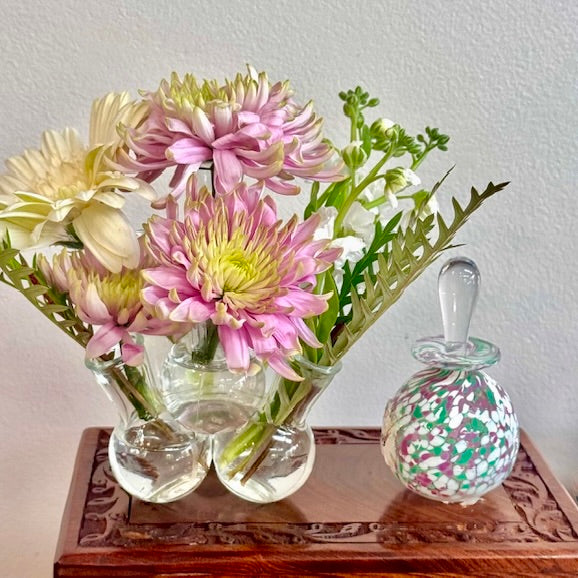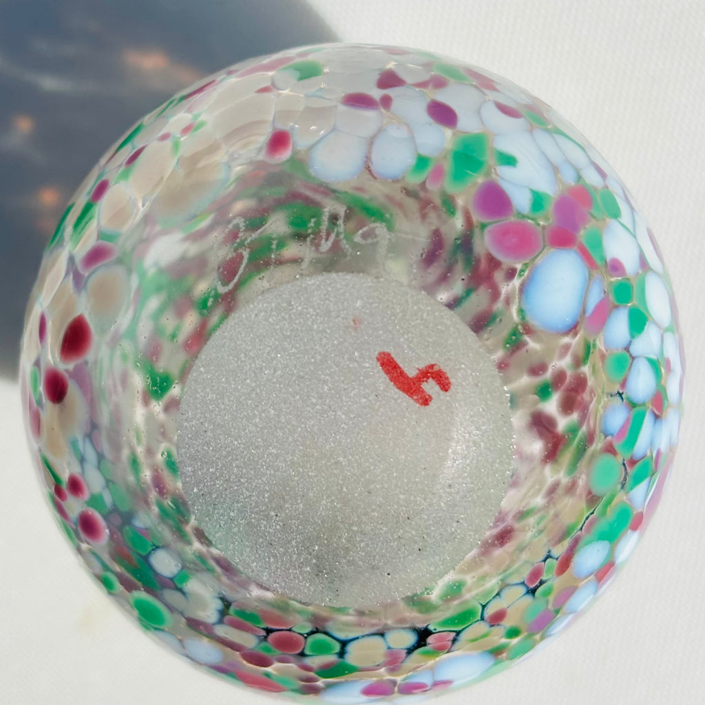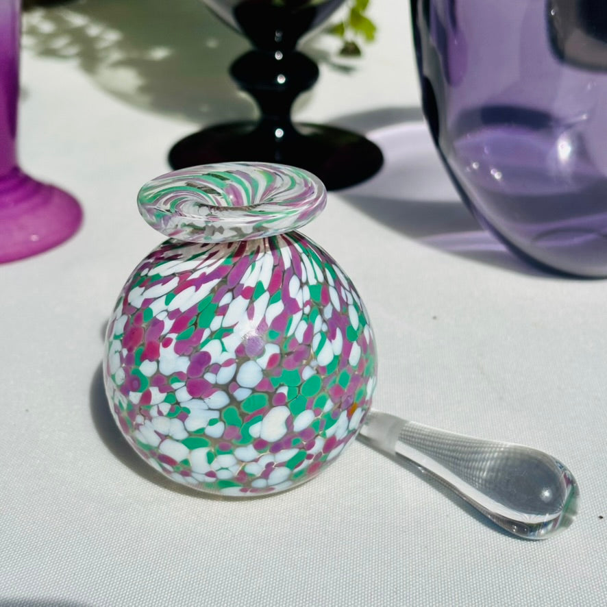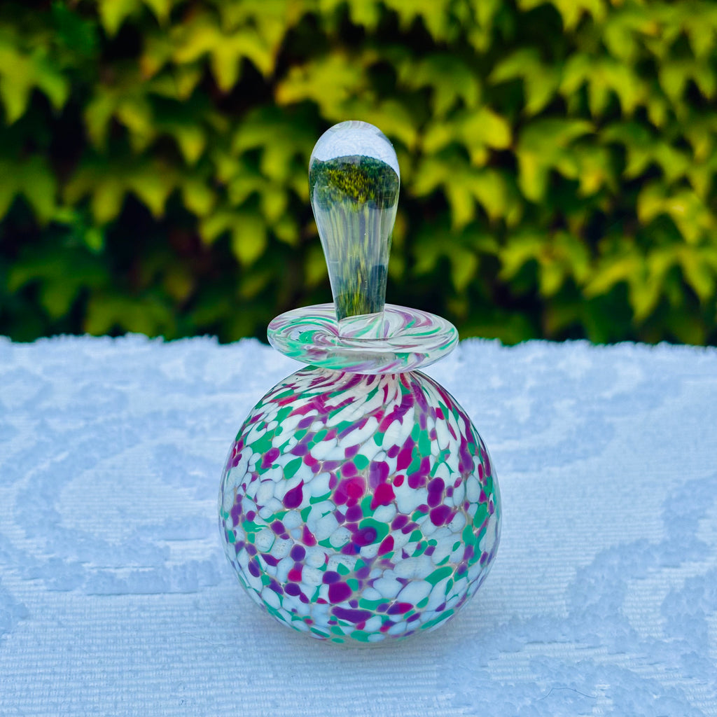 This Art Glass Perfume Bottle With Glass Topper is a playful and elegant piece signed by the artist. This unique bottle showcases exquisite craftsmanship, with vibrant colors and a delicate glass topper. Beyond its practical use, it’s a miniature work of art that brightens your any space. Whether as a collectible or gift, this delightful bottle is a celebration of creativity and style.