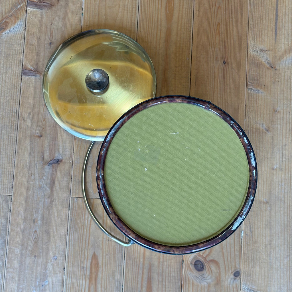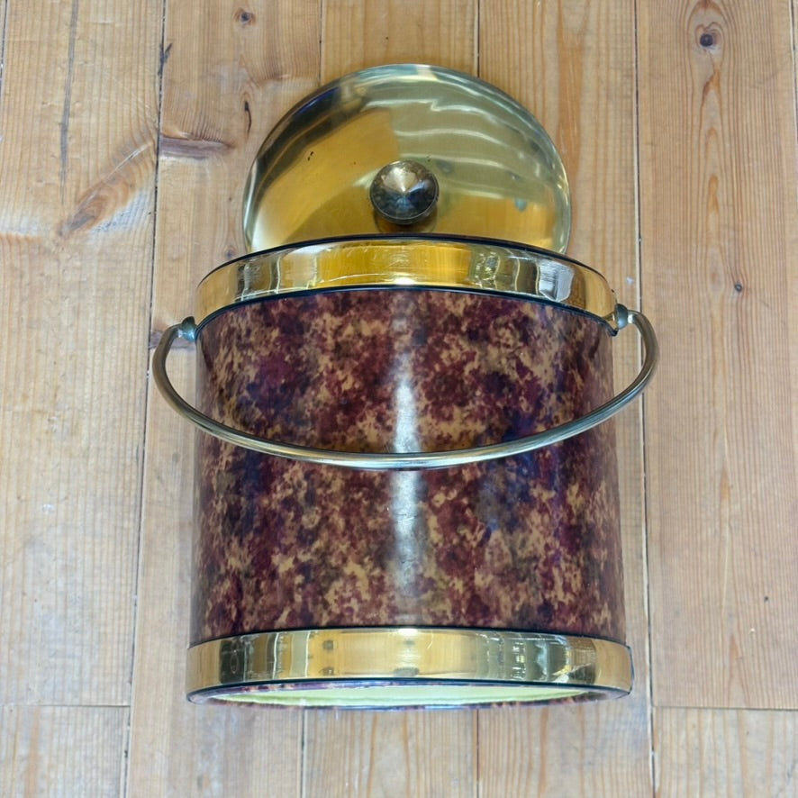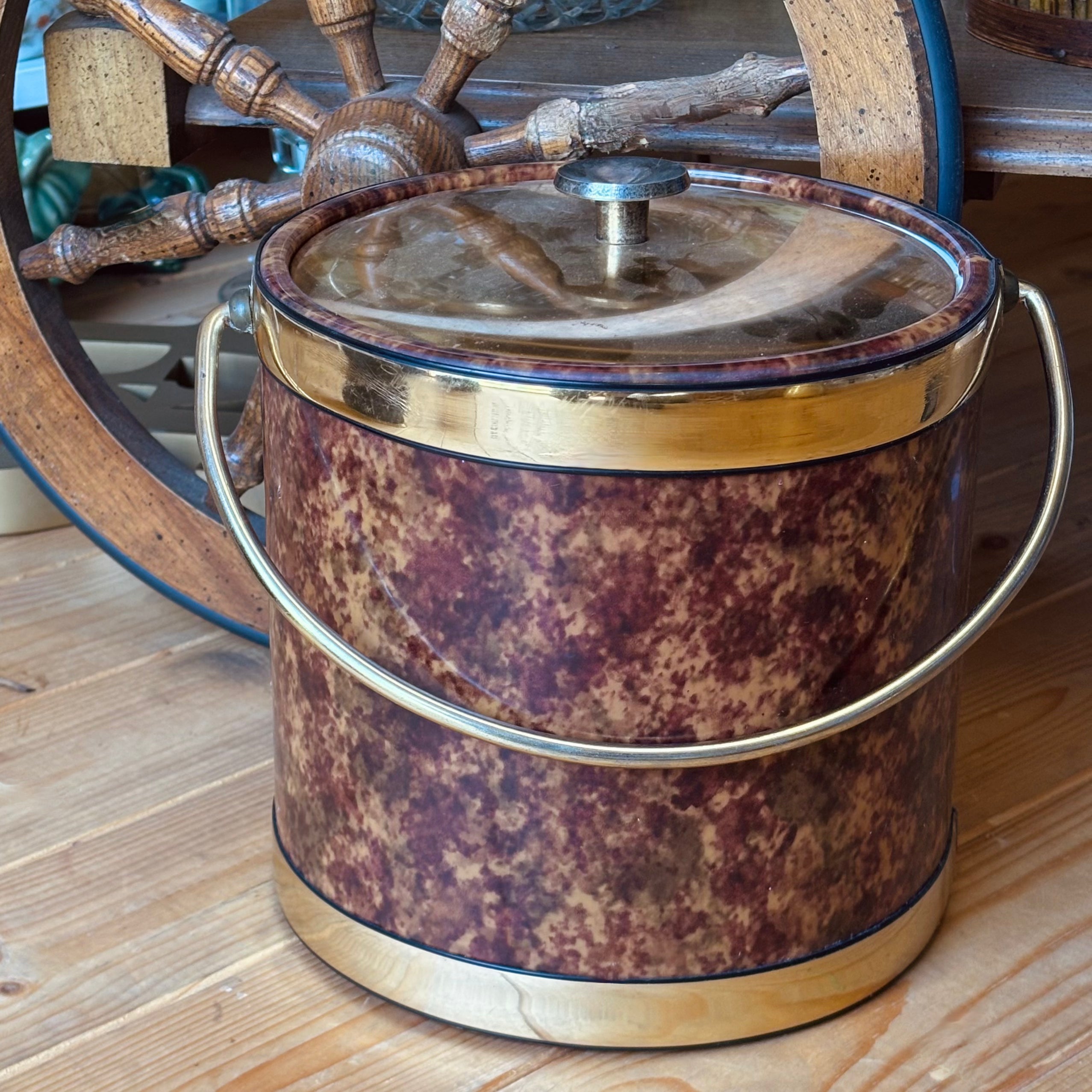Get your hands on this unique Kraftware MCM Ice Bucket! This Tortoise Shell and Gold Vinyl Ice Bucket has been well used and can add some vintage pizzazz to your bar cart! Kraftware has been a family-owned business for over 35 years. Located in central NJ, many of their products were manufactured in the U.S.
