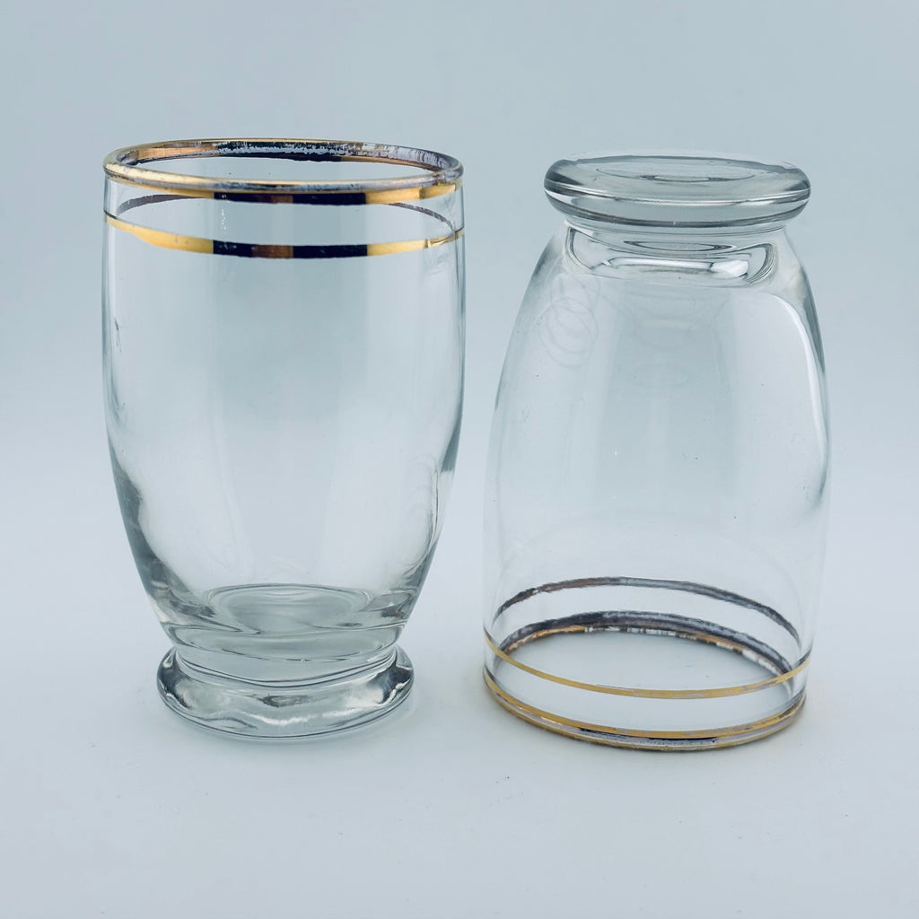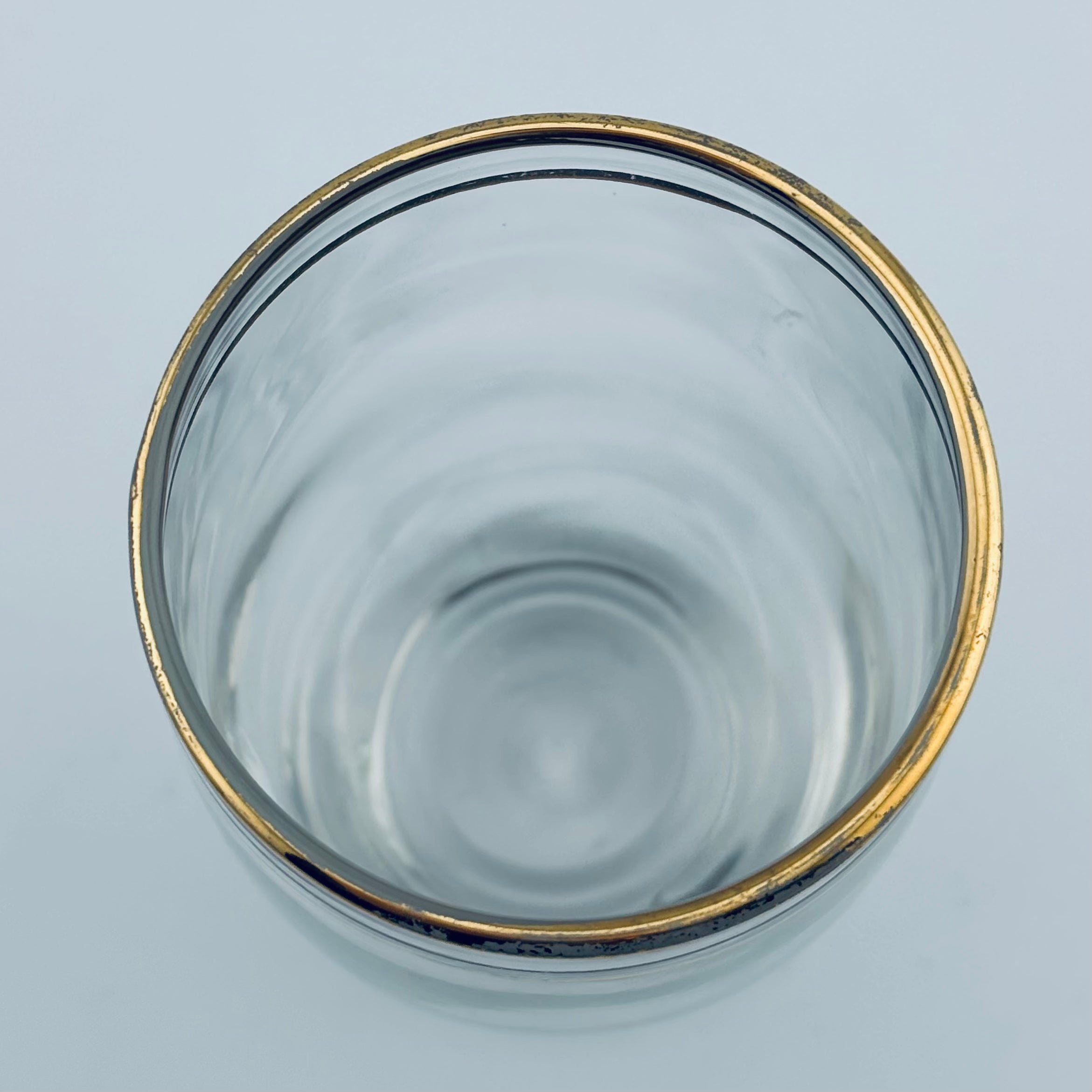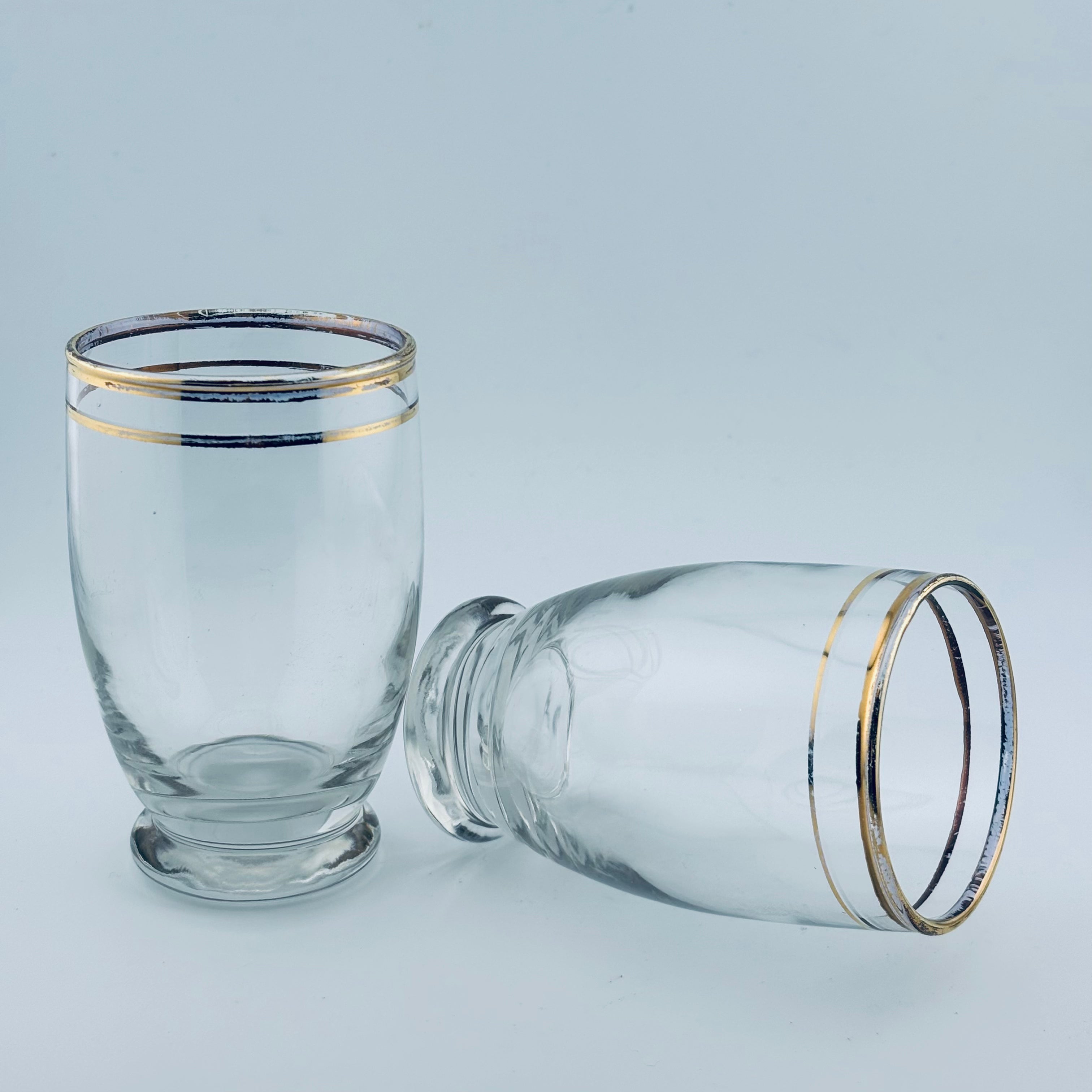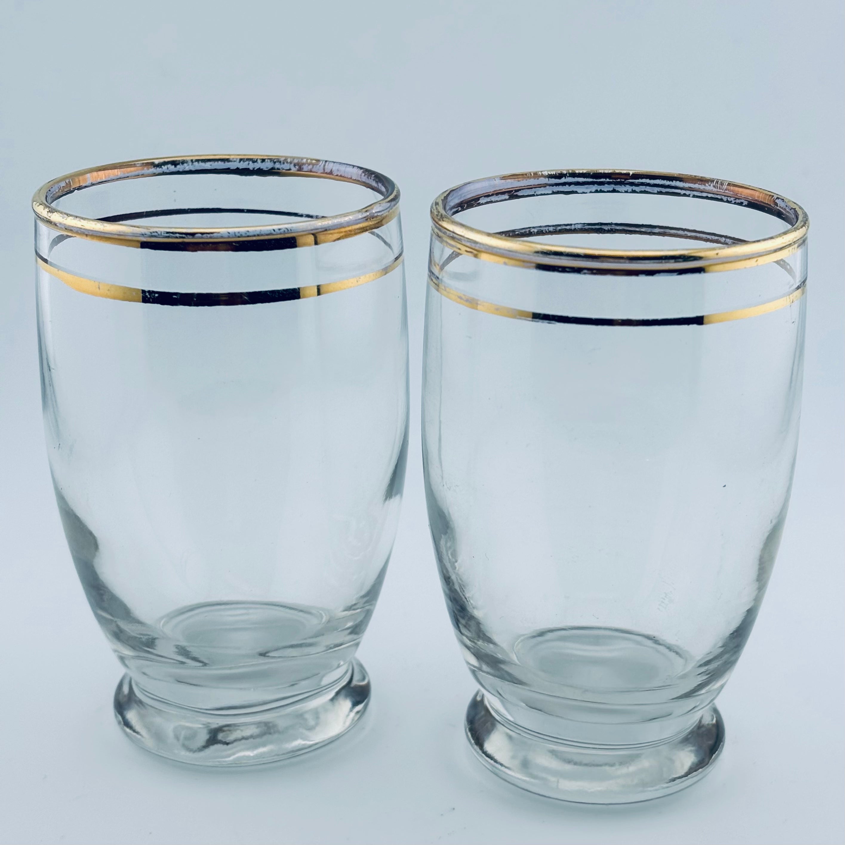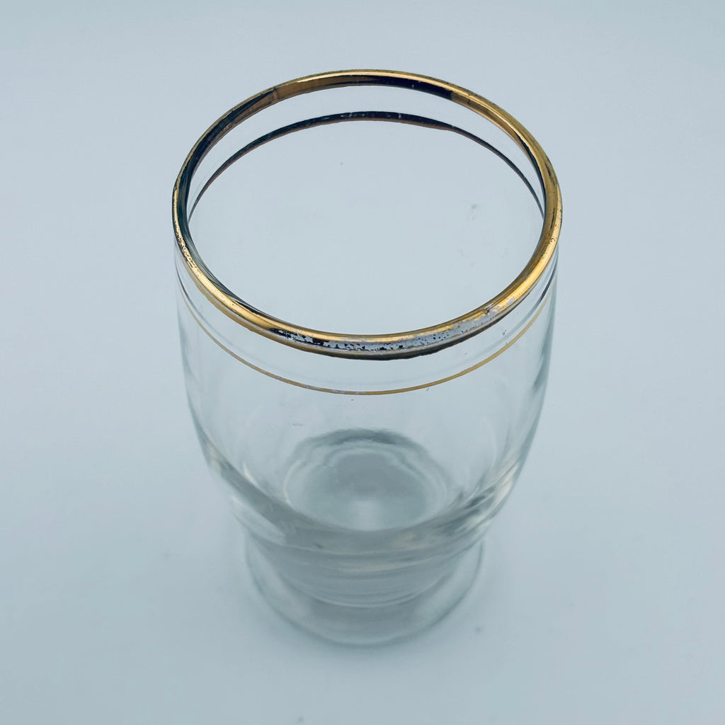 Give your drink some glitz (without the big bucks) with the popular Federal Glass Double Gold Ringed Juice Glass. (Some of the gold may be a bit faded) You don't have to stick to juice, these glasses are cool for wine or whatever you fancy. The Federal Glass Company began as a hands-on business in Columbus, Ohio way back in the 1900s. Their initial products were pressed goods.They used metal molds and hot liquid glass to craft their unique line of glassware, producing various drinking glasses and household items until 1979 when the factory ceased operation.