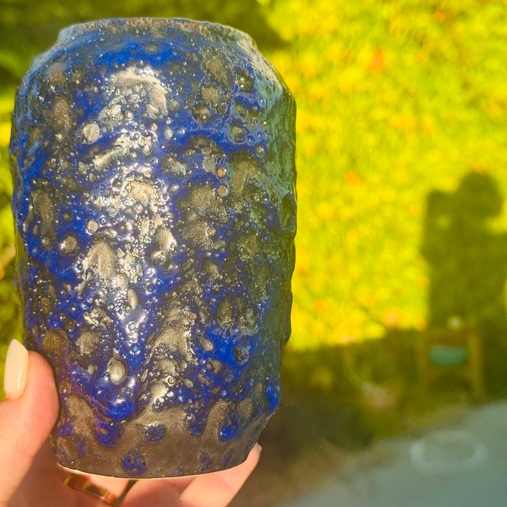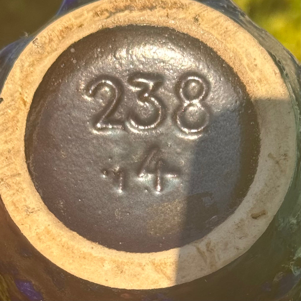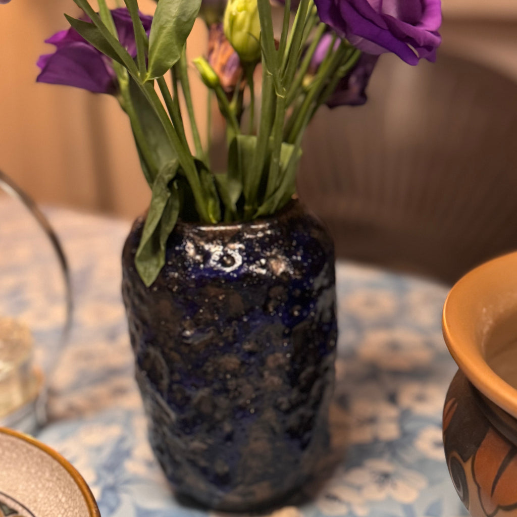 This playful gorgeous Midnight Blue Fat Lava Vase, marked 238-14 on the bottom, dates back to the groovy 1970s. Known for its thick, lava-like glaze, this style—popular among German potters of the era—adds a bold, textured vibe to any space. The unique glaze speaks to a vintage artistic flair that’s truly one of a kind.