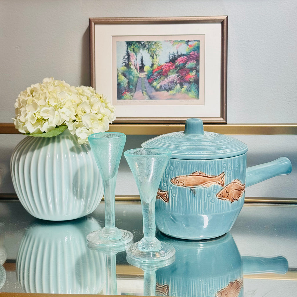 Dive into a splash of midcentury charm with this Hand-painted Ceramic Herring Pot, bursting with playful fish in a lively blue and turquoise swirl. Inspired by the iconic Włocławek faience style crafted by Wit Płażewski in the 1950s, each pot is a unique piece of functional art. Perfect for serving your favorite pickled fish or as a quirky centerpiece!