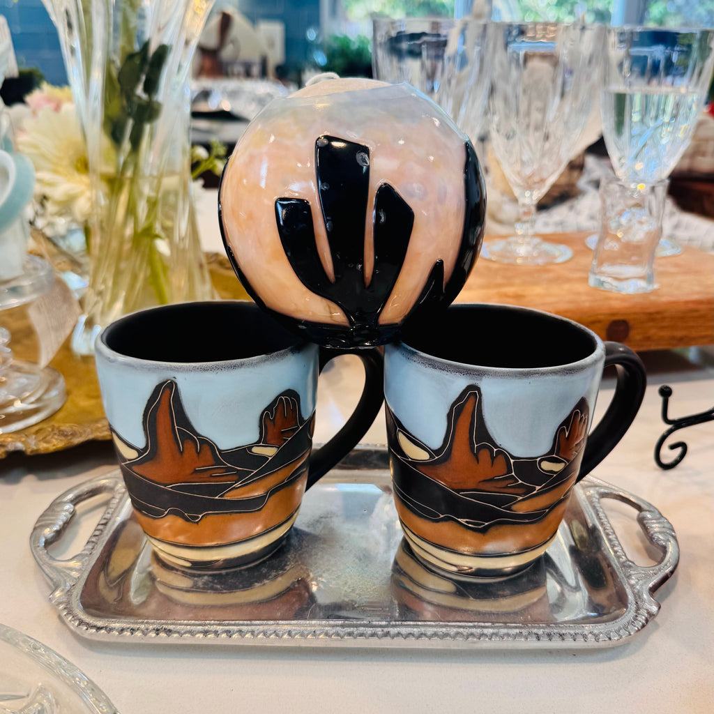 Bring the spirit of the Southwest into your space with this hand-carved solid wax candle. Its playful design features a sculpted mountain and cacti desert scene that wraps all the way around, adding a touch of desert charm to any room.