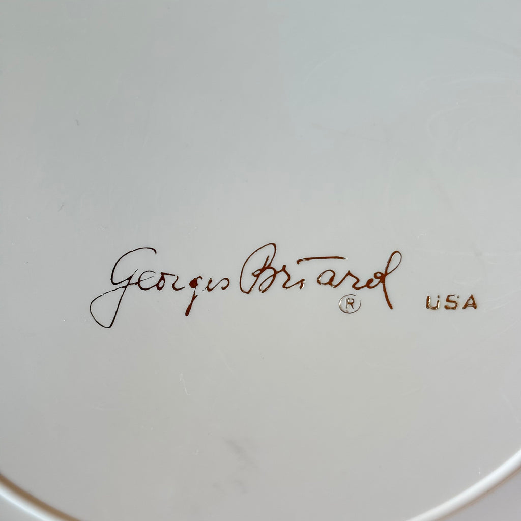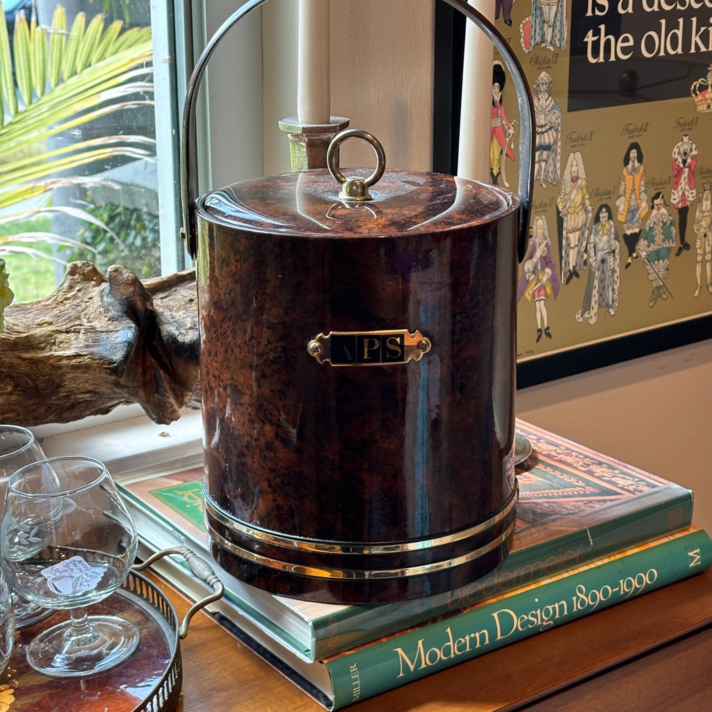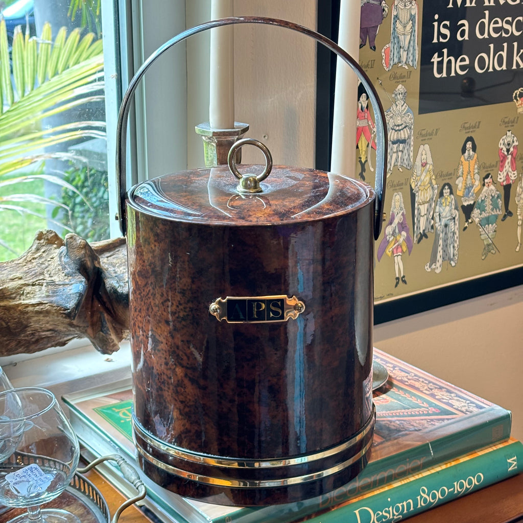 Get your hands on this elegant and unique Georges Briard Signed Lucite and Tortoise Vinyl Ice Bucket ! It also has an Initial APS monogram (but don't worry, it's a removable sticker). In pristine condition, this bucket represents the quirky and playful design style of Georges Briard, an American designer from the mid-20th century. His iconic dishware and glassware adorned the shelves of high-end stores like Neiman Marcus and Bonwit Teller.